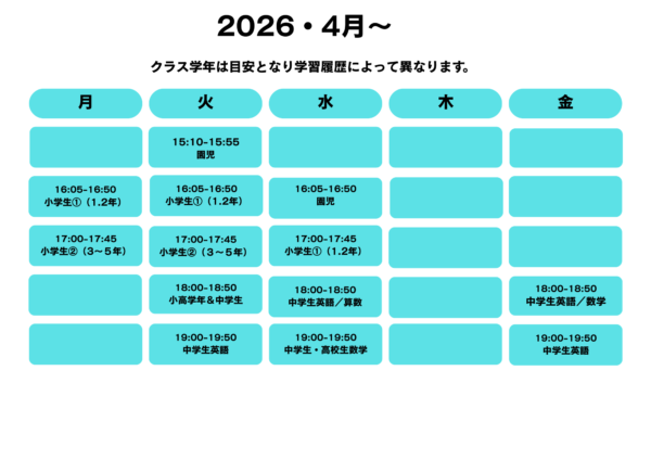 親子クラス、園児クラス、小学生クラス、中学生クラス(中学生では学校の授業対策にも力をいれております。)と0歳~中学生までの英語教室になります。