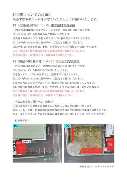 駐車場内での大きな声での会話はお控え下さい。